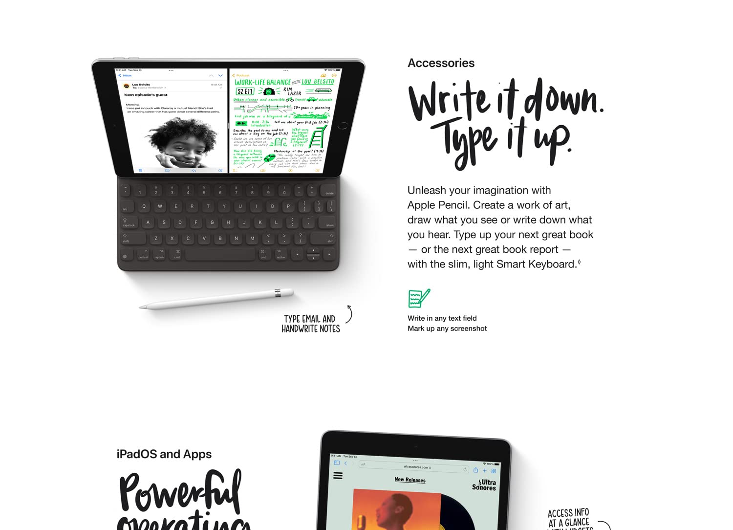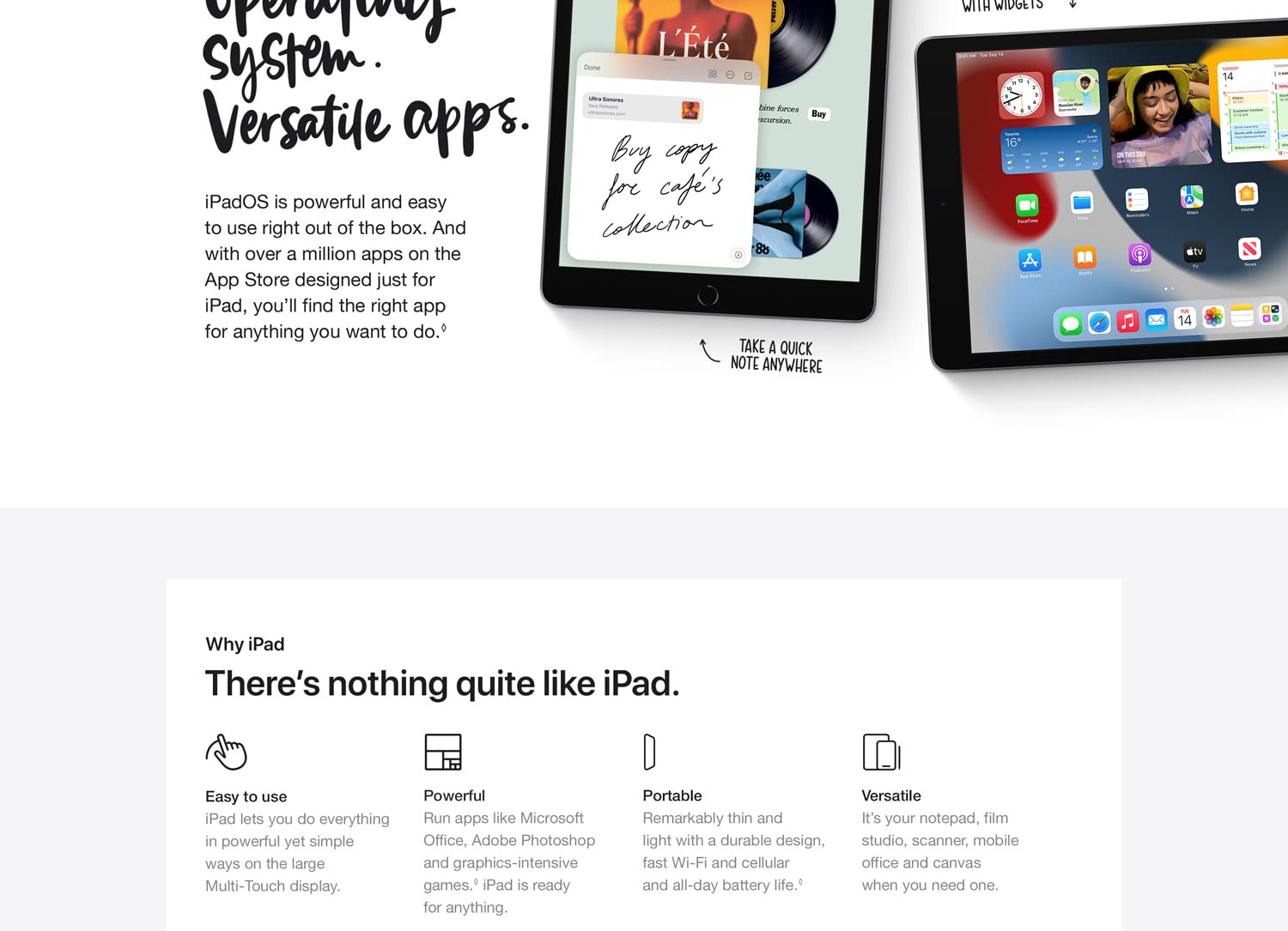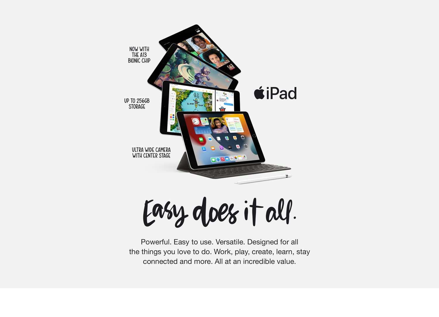 - iPadOS + apps: iPadOS makes iPad more productive, intuitive and versatile. With iPadOS, run multiple apps at once, use Apple Pencil to write in any text field with Scribble, and edit and share photos. iPad comes with essential apps like Safari, Messages and Keynote, with over a million more apps designed specifically for iPad available on the App Store